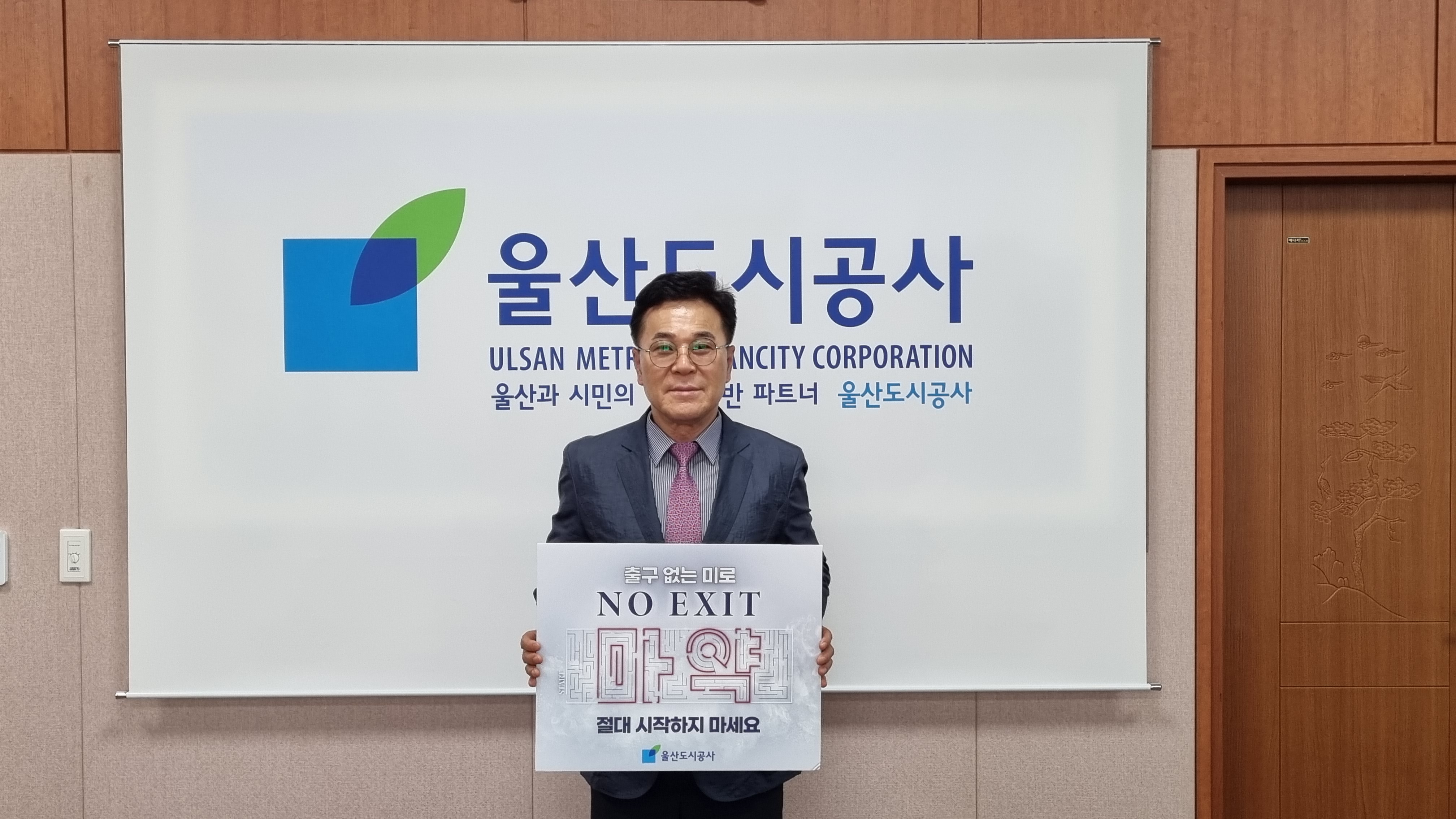 윤두환 울산도시공사 사장은‘NO EXIT’ 마약근절 릴레이 캠페인에 동참했다고 14일 밝혔다. ‘NO EXIT 릴레이 캠페인'은 마약의 심각성을 환기하고 마약중독을 미연에 방지하기 위해 지난 4월 경찰청과 마약퇴치운동본부가 시작한 범국민적 운동이다.